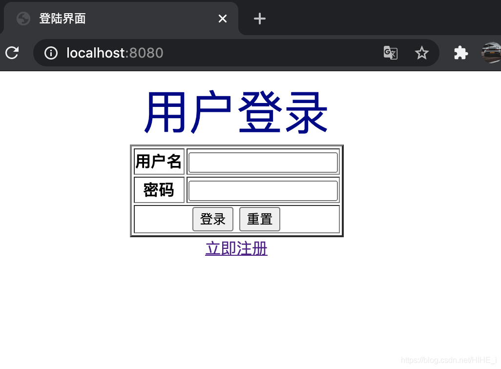 <!DOCTYPE html> <html lang="en"> <head> <meta charset="UTF-8"> <title>登陆界面</title> </head> <body> <div align="center"> <font size="10px" color="#00008b">用户登录</font> <form action="/login" method="post"> <table border="2"> <tr> <th>用户名</th> <td><input type="text" name="userName"/></td> </tr> <tr> <th>密码</th> <td><input type="password" name="password"/></td> </tr> <tr> <td colspan="2" align="center"> <input type="submit" value="登录"/> <input type="reset" /> </td> </tr> </table> </form> <a href="/jsp/register.jsp">立即注册</a> </div> </body> </html>
