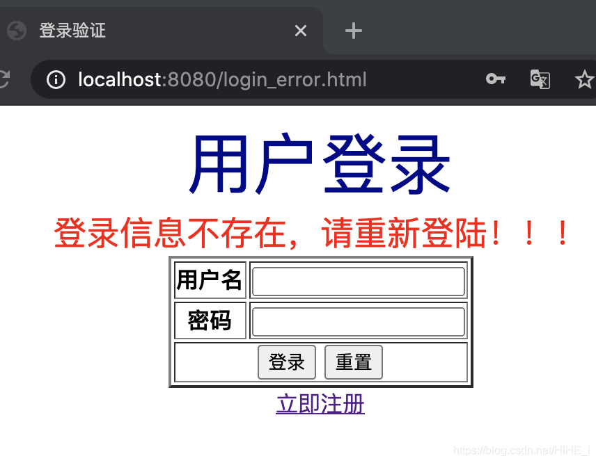 <!DOCTYPE html> <html lang="en"> <head> <meta charset="UTF-8"> <title>登录验证</title> </head> <body> <div align="center"> <font size="10px" color="#00008b">用户登录</font><br> <font size="5px" color="red">登录信息不存在,请重新登陆!!!</font> <form action="/login" method="post"> <table border="2"> <tr> <th>用户名</th> <td><input type="text" name="userName" /></td> </tr> <tr> <th>密码</th> <td><input type="password" name="password" /></td> </tr> <tr> <td colspan="2" align="center"> <input type="submit" value="登录"/> <input type="reset"> </td> </tr> </table> </form> <a href="/jsp/register.jsp">立即注册</a> </div> </body> </html>