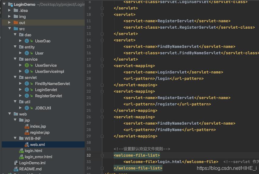 <?xml version="1.0" encoding="UTF-8"?> <web-app xmlns="http://xmlns.jcp.org/xml/ns/javaee" xmlns:xsi="http://www.w3.org/2001/XMLSchema-instance" xsi:schemaLocation="http://xmlns.jcp.org/xml/ns/javaee http://xmlns.jcp.org/xml/ns/javaee/web-app_4_0.xsd" version="4.0"> <servlet> <servlet-name>LoginServlet</servlet-name> <servlet-class>servlet.LoginServlet</servlet-class> </servlet> <servlet> <servlet-name>RegisterServlet</servlet-name> <servlet-class>servlet.RegisterServlet</servlet-class> </servlet> <servlet> <servlet-name>FindByNameServlet</servlet-name> <servlet-class>servlet.FindByNameServlet</servlet-class> </servlet> <servlet-mapping> <servlet-name>LoginServlet</servlet-name> <url-pattern>/login</url-pattern> </servlet-mapping> <servlet-mapping> <servlet-name>RegisterServlet</servlet-name> <url-pattern>/register</url-pattern> </servlet-mapping> <servlet-mapping> <servlet-name>FindByNameServlet</servlet-name> <url-pattern>/findByName</url-pattern> </servlet-mapping> <!--设置默认欢迎文件规则--> <welcome-file-list> <welcome-file>login.html</welcome-file> <!--servlet 作为默认欢迎文件 ‘/"需要去掉--> </welcome-file-list> </web-app>