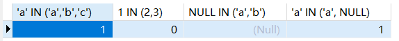 SELECT "a" IN ("a","b","c"), 1 IN (2,3), NULL IN ("a","b"), "a" IN ("a", NULL);