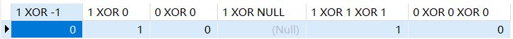 SELECT 1 XOR -1, 1 XOR 0, 0 XOR 0, 1 XOR NULL, 1 XOR 1 XOR 1, 0 XOR 0 XOR 0;