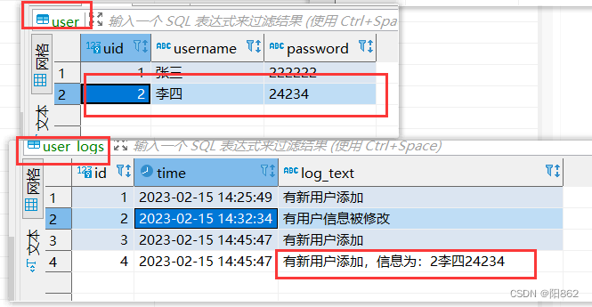 create database if not exists test_trigger; use test_trigger; -- 用户表 create table `user` ( uid int primary key, username varchar(50) not null, password varchar(50) not null ); -- 用户信息操作日志表 create table user_logs( id int primary key auto_increment, time timestamp, log_text varchar(255) ); -- 需求1:当user表添加一行数据,则会自动在user_log添加日志记录 -- 定义触发器:trigger_test1 create trigger trigger_test1 after insert on user for each row insert into user_logs values(null,now(),"有新用户添加"); -- 在user表添加数据,让触发器自动执行 insert into `user` values(1,"张三","123456");
