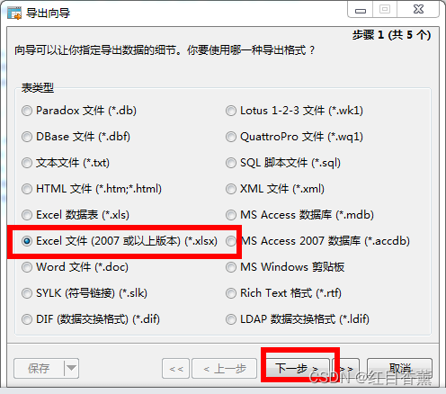 点击导出向导后会出现以下提示,我们选择【Excel文件(2007或以上版本)(*.xlsx)】格式进行导出,单选选择后点击下一步。