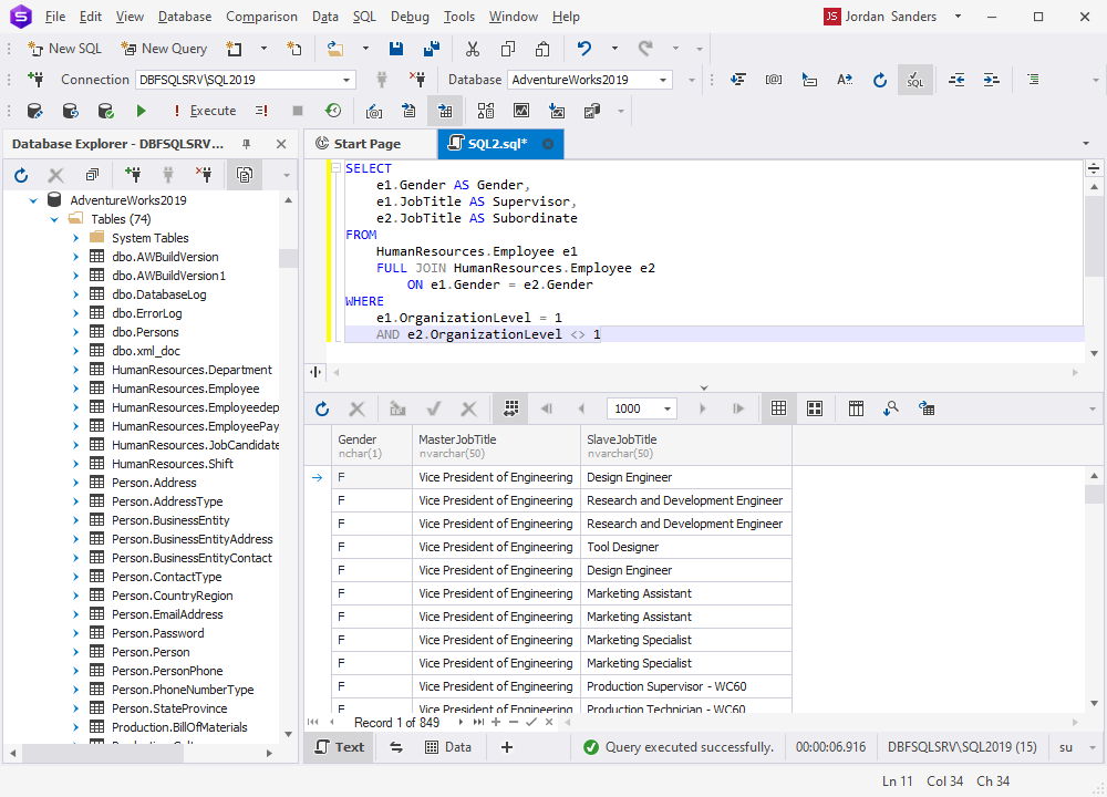 SELECT e1.Gender AS Gender, e1.JobTitle AS Supervisor, e2.JobTitle AS Subordinate FROM HumanResources.Employee e1 FULL JOIN HumanResources.Employee e2 ON e1.Gender = e2.Gender WHERE e1.OrganizationLevel = 1 AND e2.OrganizationLevel <> 1