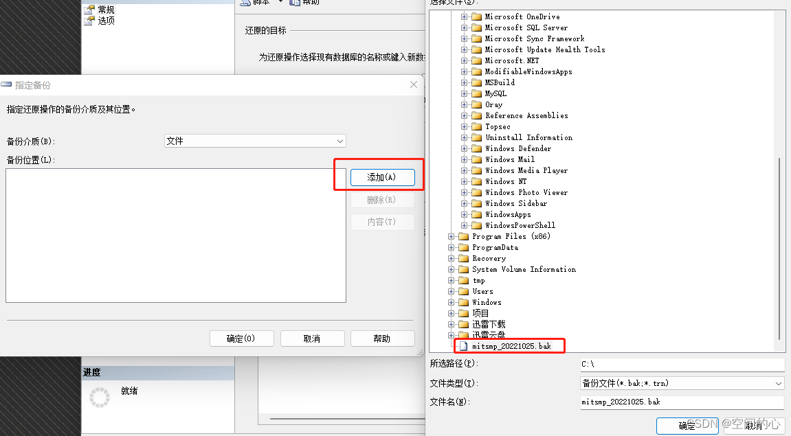 选择需要还原到的数据库→添加设备→选择备份文件→确定
