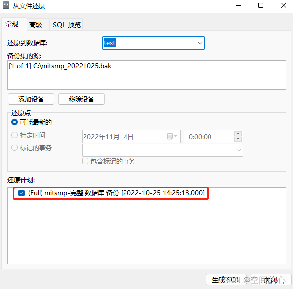 选择高级→勾选WITH REPLACE→选择数据文件和日志文件存放位置(这里不选择会默认放置在之前服务器/电脑的地址)→生成SQL