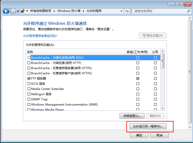 控制面板–>Windows防火墙–>允许程序或功能通过Windows防火墙–>新窗口中允许运行另一程序”。在浏览中找到“C:\Windows\System32\svchost.exe”,打开并添加。