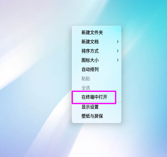 1、在桌面空白处右键选择【在终端中打开】,打开深度终端。