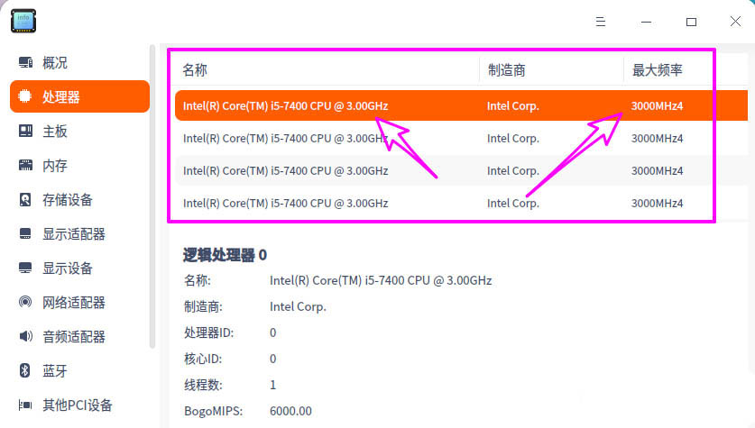 3、点【处理器】在右侧信息栏可以看到处理的主频率。