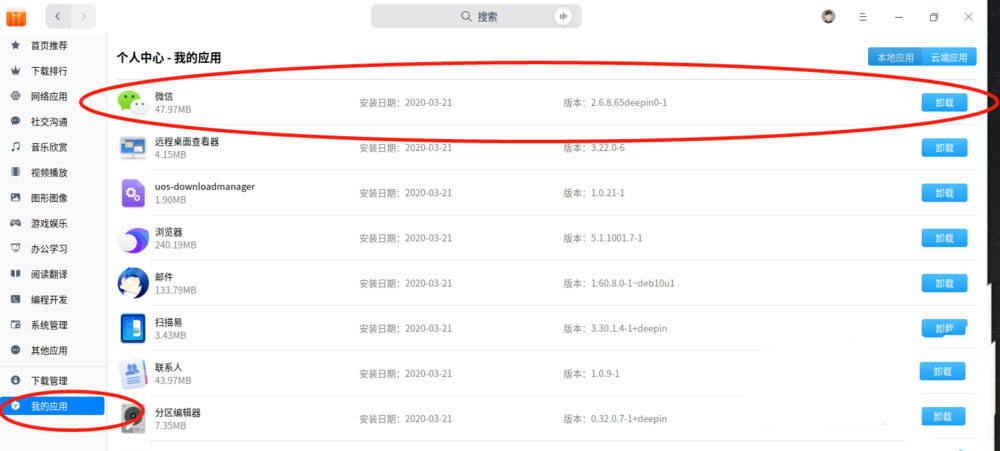 6、点击应用商店,我的应用,可以看到微信已经安装好了,同时也可以看到已经安装的程序。