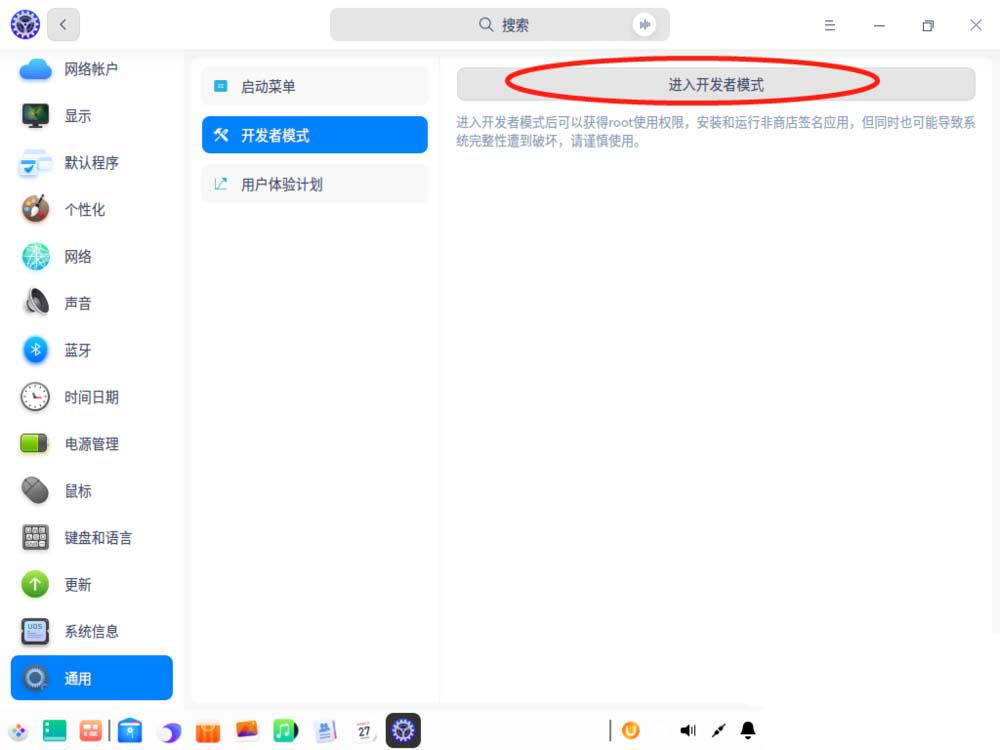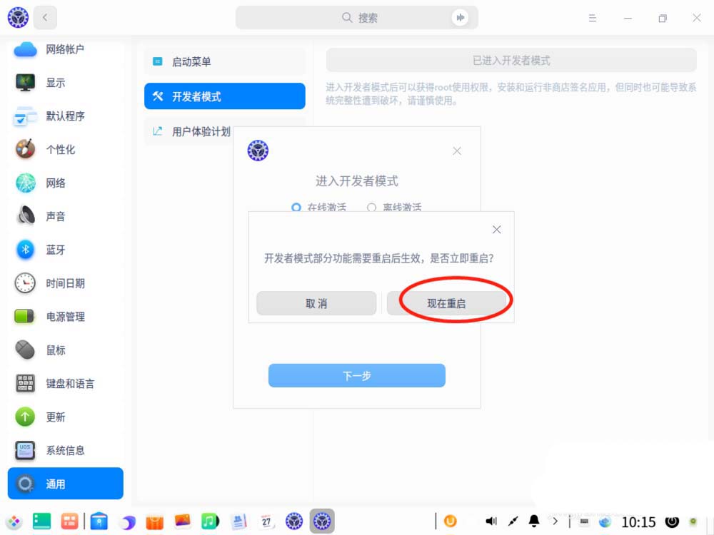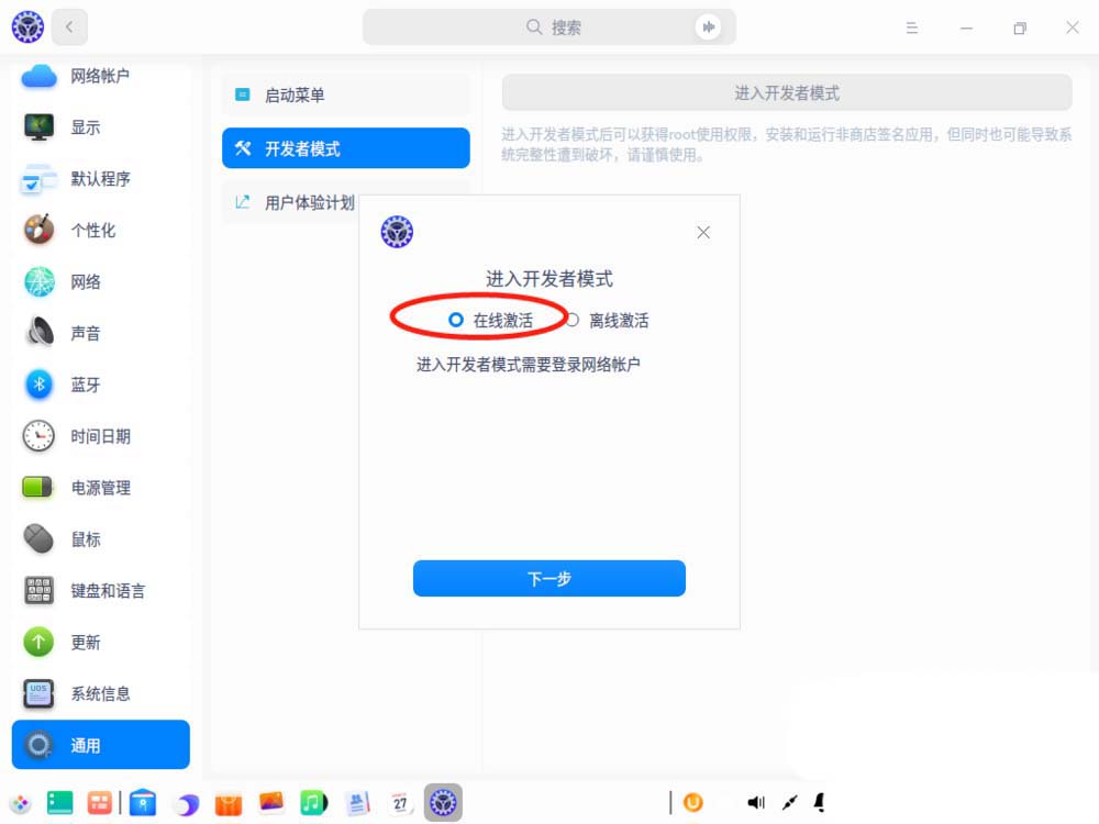 对于已经联网的设备可以直接转到UOS系统的控制中心(即设置)、通用、开发者模式、在线激活即可开启该模式。