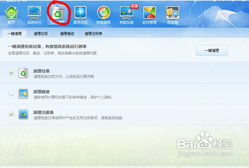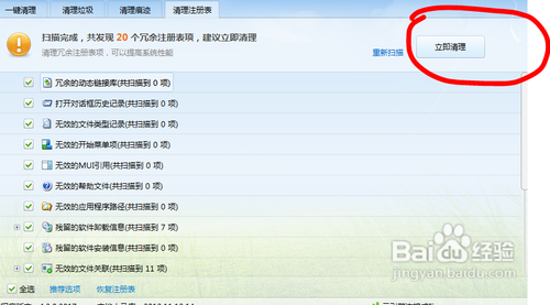 2、在“垃圾清理”页面,选择“清理注册表”,即可看到清理注册表的页面,如下图所示: