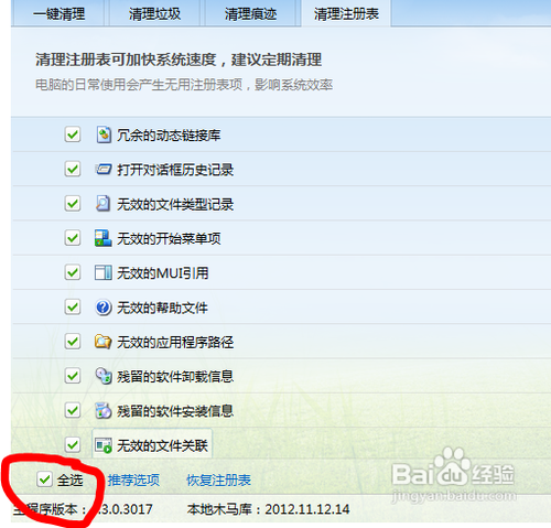 4、如果你对电脑不是很精通,害怕清理注册表导致机器瘫痪,可以选择“推荐选项”,如下图所示:
