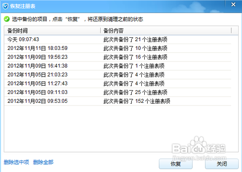 7、如果不小心清理错了,可以点击“恢复注册表”,然后选择你想要恢复的即可,如下图所示: