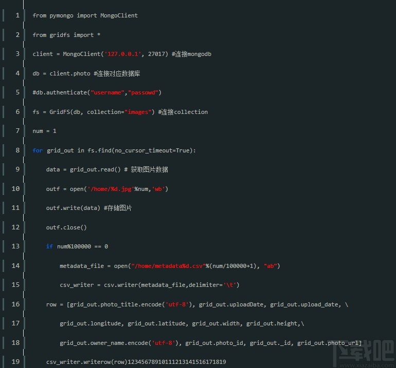 2.在使用GridFS来存储图片数据之后,想要将图片数据下载下来查看时可以用到下图所示的代码,其中如果有图片数据是用多个chunks来存储的话,下载下来之后会自动合并它们。